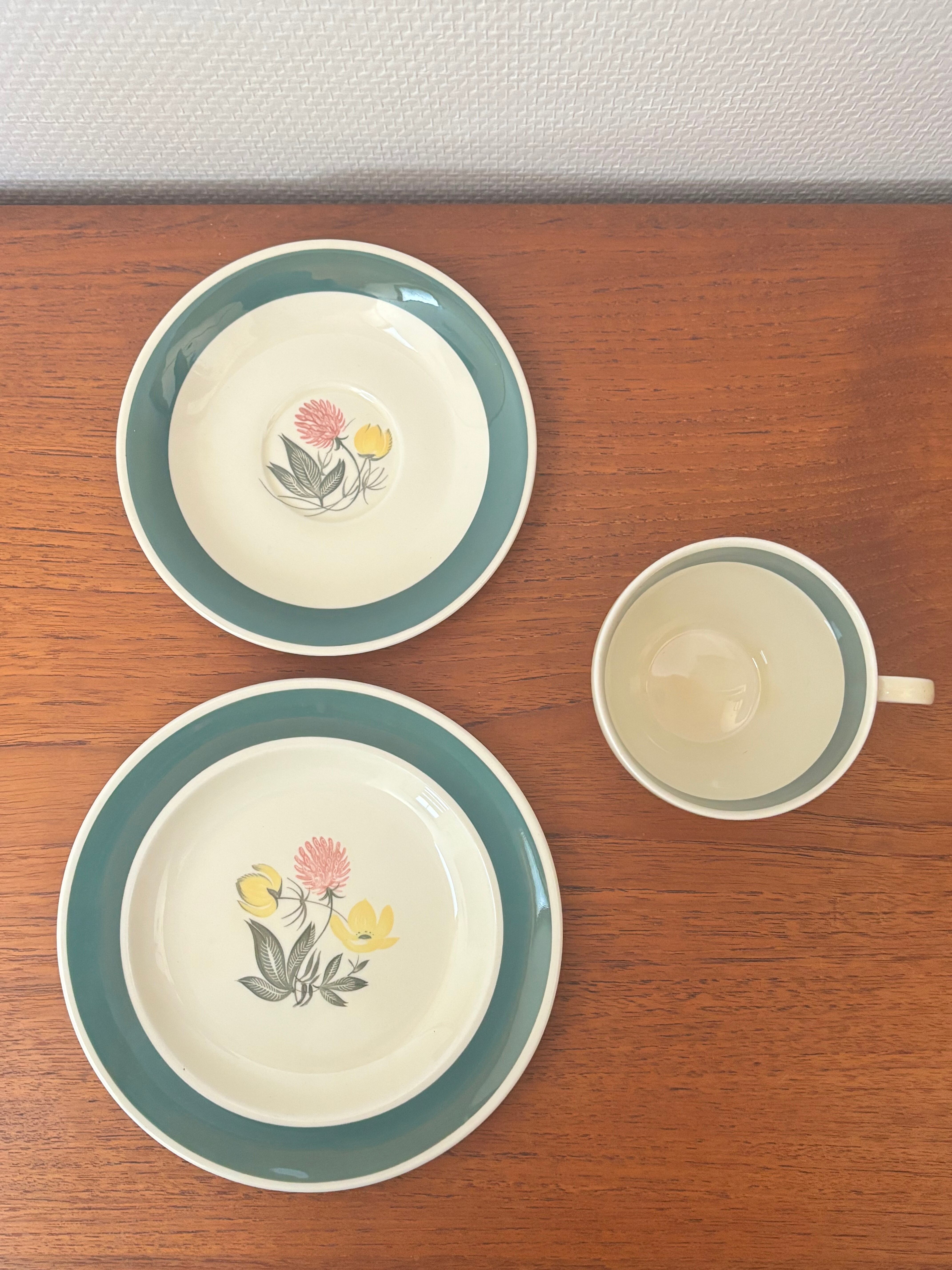 英国スージー・クーパーによる、青りんどうのモチーフが美しく描かれた「ブルージェンシャン」トリオ。1959年のデザインで、陶器製スージークーパーの中では、磁器も出始めていましたが、陶器も制作されていました。30年代ごろの陶器と比べて技術も進歩し、陶器の温かみと磁器の強度・白さを兼ね備えた、半磁器なので薄手でも割れにくい点が魅力です。