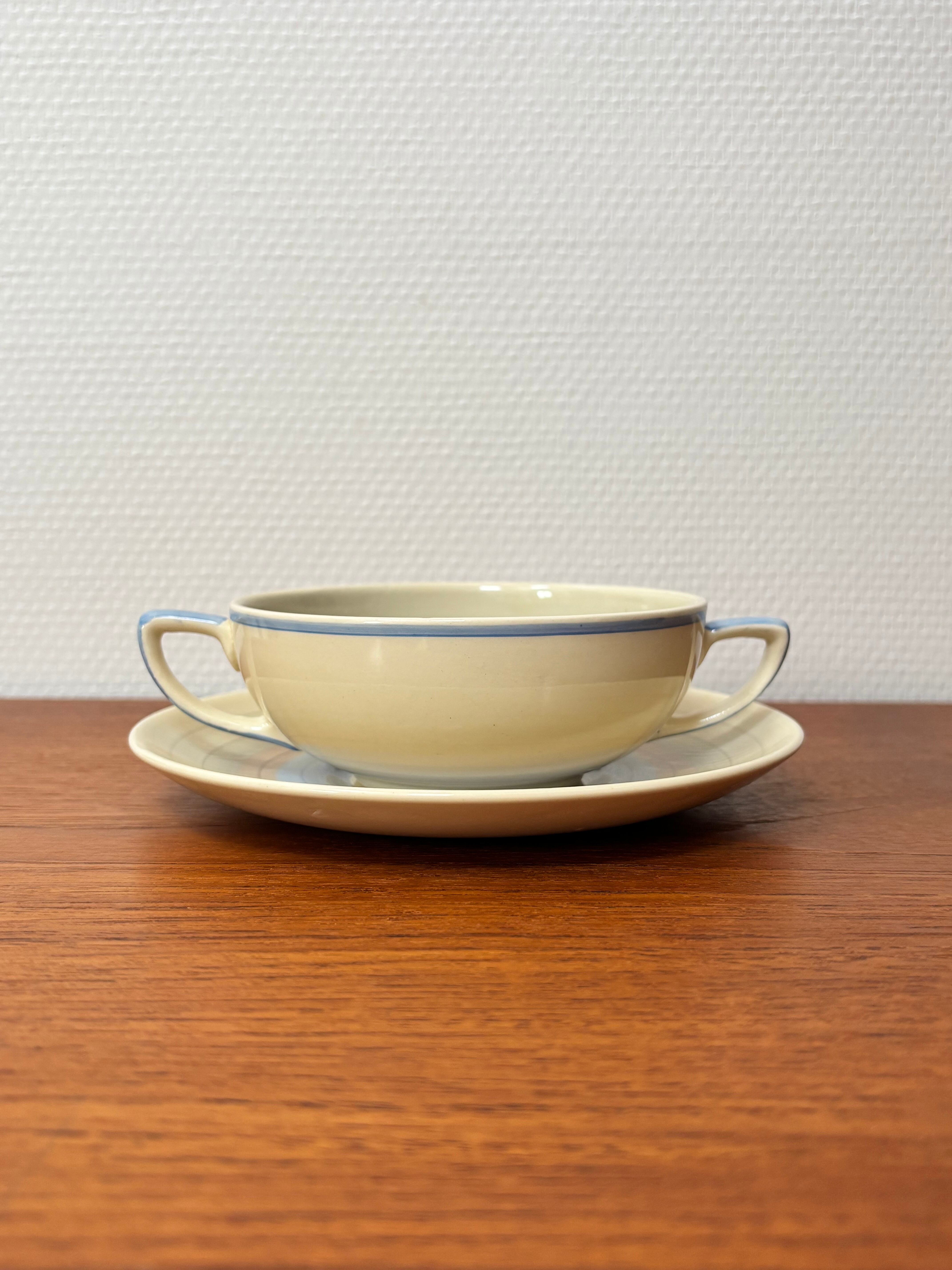 英国スージー・クーパーによる、ウエディングリング のスープボウルとソーサー「青」。1930年代から1960年代まで制作された人気の図案です。シンプルなのに温かみのある青色のリングが美しく、手に取るたびに豊かな気持ちになる商品です。